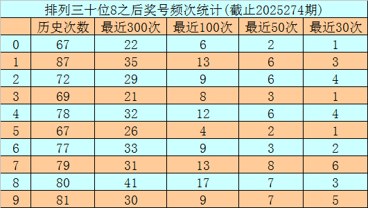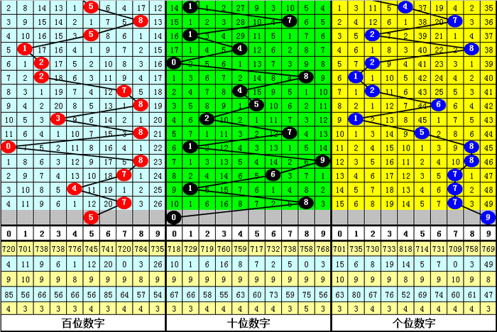 第二位杀号:第二位上期开出奖号为8,该位历史上奖号8开出了758次,最近100次第二位奖号出现8后,下期落号0-9次数从高到低分别为:号码8→17次,1、7→13次,4→12次,2、6、9→9次,3→8次,0→6次,5→4次。