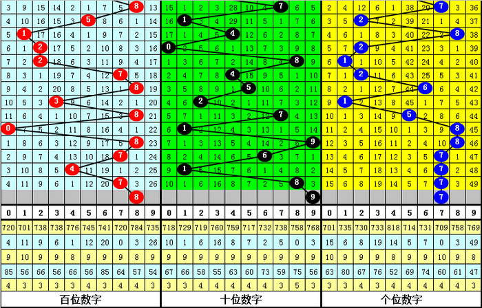 百位:近期大小 号码出现次数基本相当,上期开出大号之后,本期预计大号重复出现;另外,在最近20期开奖中,该位以1路和2路号码为主,0路号码出现相对较少,本期防0路号码再次轮空,参考号码8。